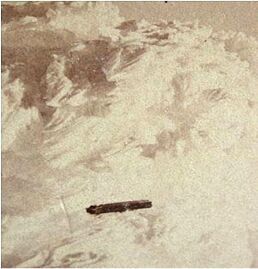 10.1947年,3名美国陆军航空队老兵在报告中说,他们在美国加利福尼亚州卡塔兰( Catalan)岛上空看到6个飞碟,前航空摄影师鲍勃•江表示,他成功拍摄到其中一个。在照片的最下面可以看到蒸汽船的桅杆。